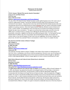After finding out the location of the conference, I began researching and creating an extensive list of “things to do” and “restaurants” to visit. I looked at the Visit Richmond tourist website, searched Food Network‘s page to see if any interesting restaurants were listed, searched the New York Times travel guides, and cross referenced these results with Trip Advisor listings to cobble together a list of things to do and places to eat. This extensive research produced the following guides for the Richmond, VA area. Surprisingly, I discovered that there was quite a few “things to do” and “places to eat” in Richmond.