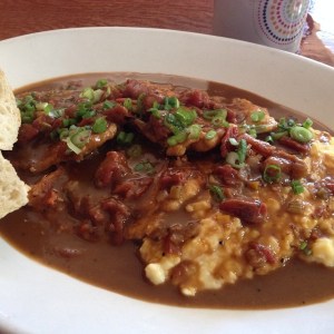 This gravy smothered thinly pounded pork loin over yellow corn cheese grits dish, the Pork Grillades, by restauranteur Johnny Giavos was one of the best things I have ever eaten.